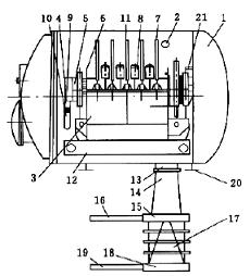 行星式加壓過濾機(jī):其煤漿槽內(nèi)裝有帶6個(gè)過濾輥的旋轉(zhuǎn)主軸,每個(gè)輥上都固定有過濾部件。這些過濾輥在其軸上轉(zhuǎn)動(dòng),并沿圓周軌道運(yùn)動(dòng),周期性地浸沒在煤漿內(nèi),第一臺(tái)試驗(yàn)樣機(jī)于1986年研制成功,但只推廣應(yīng)用兩臺(tái),以后未見報(bào)道。