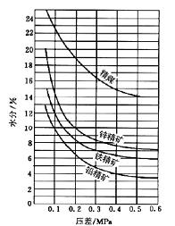 要現(xiàn)在過濾機(jī)工作的情況下改善過濾效果,更有效的方法就是提高過濾壓差,壓差對不同物料濾餅水分的影響如圖3所示。但要把真空狀態(tài)下使用的盤式過濾機(jī)改為正壓狀態(tài)下過濾,并應(yīng)用到工業(yè)生產(chǎn)中卻難度很大,主要體現(xiàn)在兩個(gè)方面:其一是由于過濾壓差增大,過濾速度加快,對于過濾機(jī)的結(jié)構(gòu)和性能提出一些要求;其二是在壓力密封條件下,要將濾餅順利排出且阻止壓氣逸出,也對加壓過濾技術(shù)提出更高的要求。